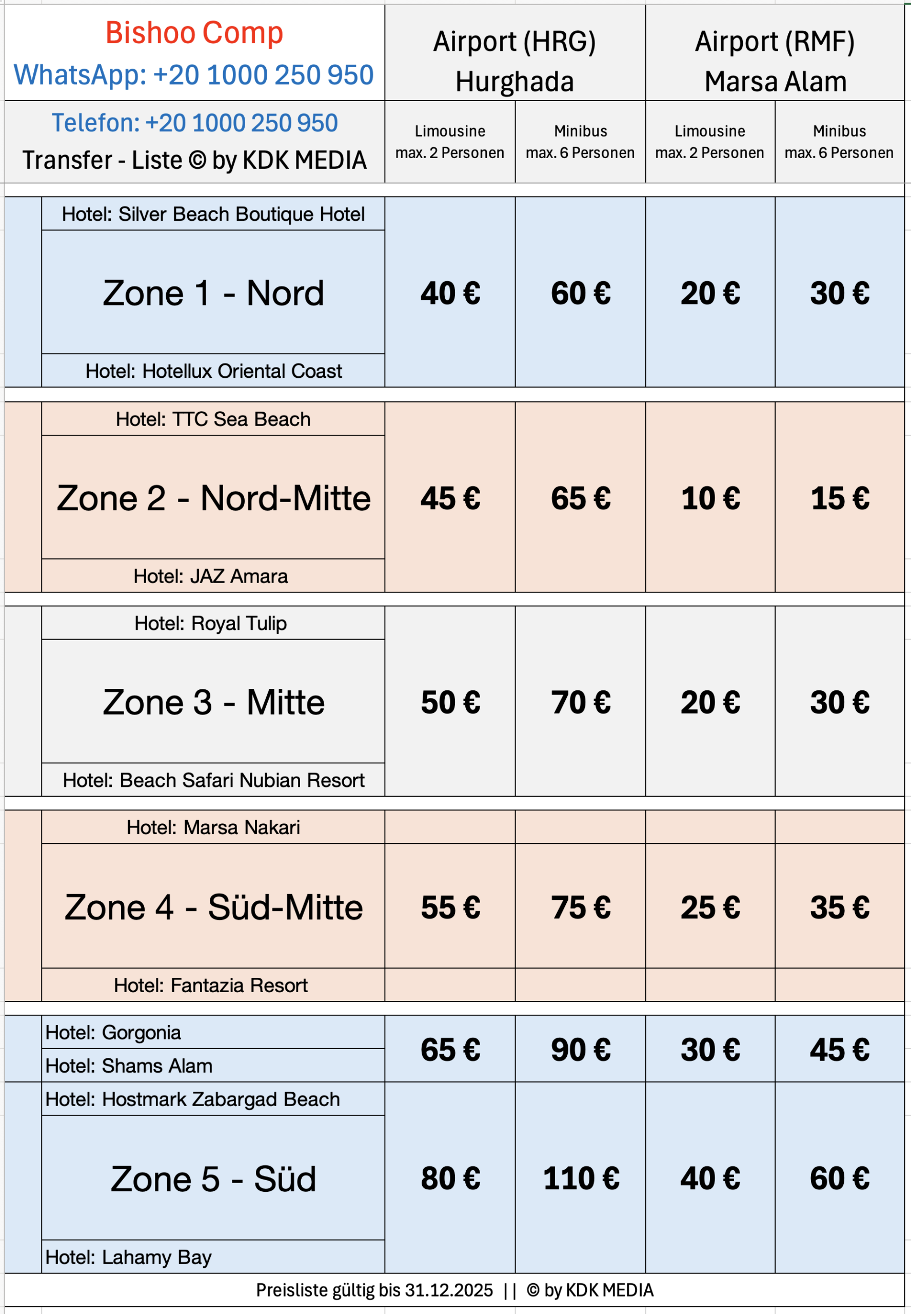 Wer eine Detaillierte Preisliste mit genauen Hotel, Kilometer und Zeiten haben möchte, der findet diese in unserer WEB-APP …. dort sind alle Preise von Bishoo hinterlegt.